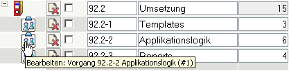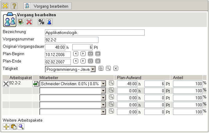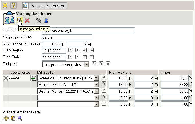 Wenn auf ein Arbeitspaket mehrere Mitarbeiter arbeiten sollen, kann für diese Zuordnung (Arbeitspaket und Mitarbeiter) der Dialog “Vorgang bearbeiten” verwendet werden.