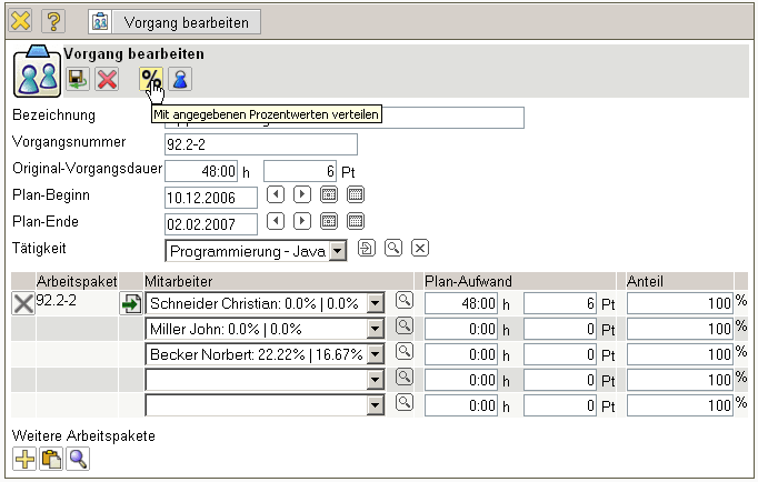 Neben Christian Schneider sollen auch die Mitarbeiter John Miller und Norbert Becker eingeplant werden. Nach der Zuordnung der Mitarbeiter in der Auswahlbox können die Aufwände absolut oder prozentual verteilt werden.