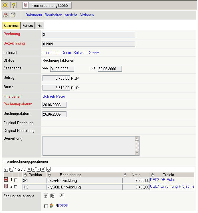 With the foreign invoices component (see illustration 15), you have the possibility to record services by suppliers and to charge them to the project (incoming invoices). The outgoing invoice function provides an overview of all payments to your creditors.