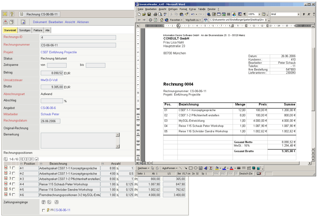 In the case of expenditure projects, you simply select the project or the sub-project you would like to invoice; Projectile enters all of the services that can be invoiced (jobs, receipts, travelling costs and other costs) into the invoice, whereby you can alter individual positions. Finally, you can have the invoice shown, have it printed out if desired and charge the services. On request, Projectile draws up the invoices/internal statements automatically at freely definable points in time (for example, at the end of the month/quarter for maintenance contracts or invoices for domains). Proof of time required for charging to your customary or “internal customer” can also be drawn up by Projectile at the touch of a button.