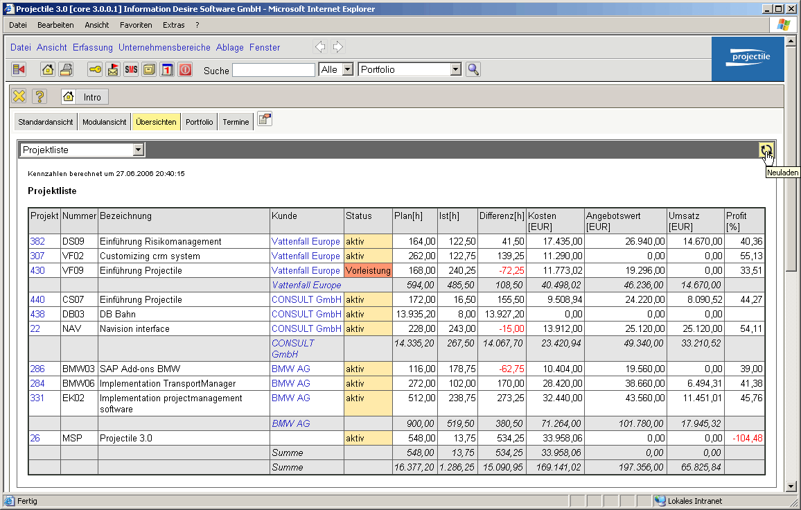 The basis of the portfolio management is the compilation of projects. In the portfolio desktop, the projects can be compiled and the axes for the analyses be pre-defined. The indexes for the axes are, for example, plan effort, actual performance, plan turnover, value of offer, amount of invoice, probability and status, risks, use, classes and further criteria.