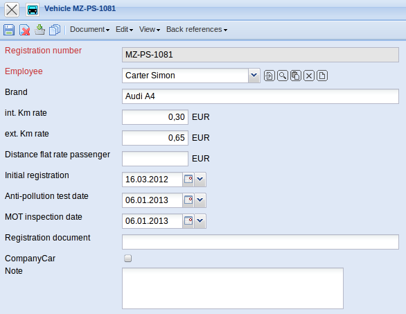 • Employee: In the field “Owner/User” the owner/user for the corresponding vehicle will be designated. Only the employees entered and listed in System come into consideration for this field. (see also form Employee)