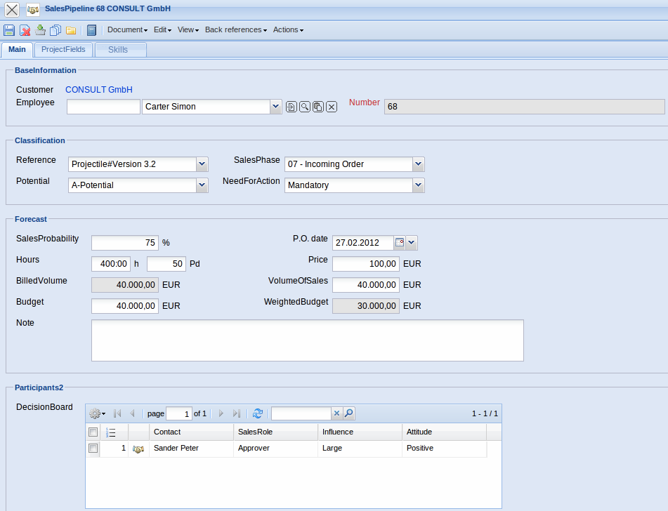 - VolumeOfSales: The potential order value of the distribution activity is stored (or calculated) here. In the example, an order of EUR 40.000,00 to the possibility of 75% is calculated in the beginning of February 2012.