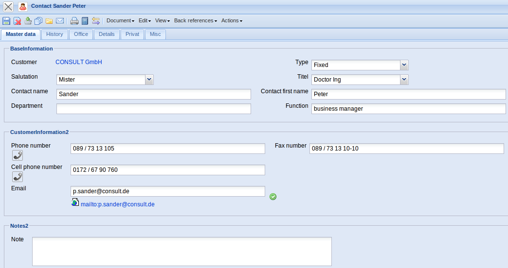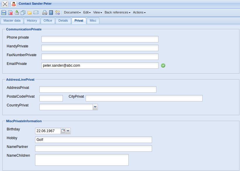 • Private Communication : Telephone, Mobile, Fax, E-mail Address and Web: These fields specify the accessibilty of the contact person via telephone (office and mobile/cell), fax and email. Clicking the email address opens the user's standard email programm with the entered email address.