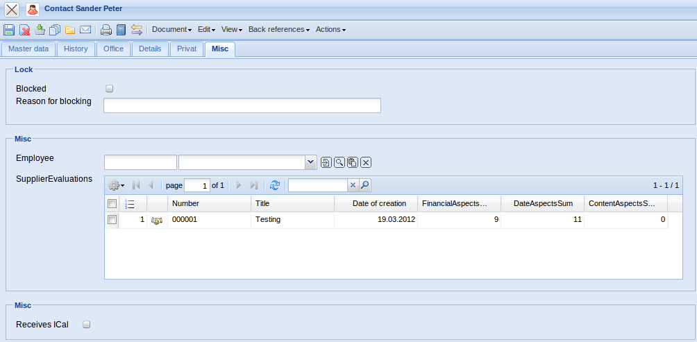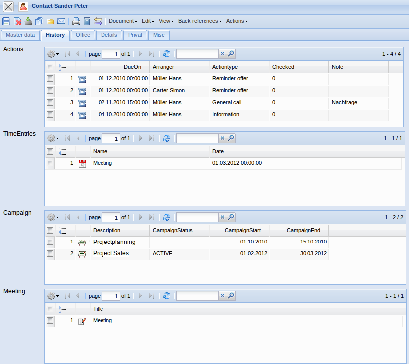 • Action: This element contains all applied actions of the contact person. The actions are administered in the Action form.