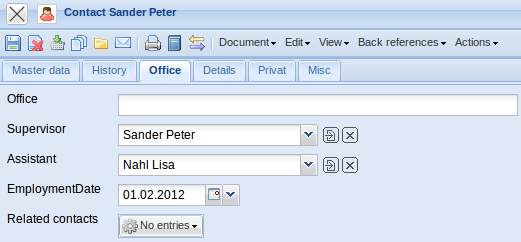 • Type: In field Type, the in Collections (see Administration Guide) defined employee relation of the contact person(external employee, permanent employee, freelance, employer, etc.) can be assigned here.