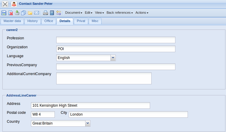 • Profession and Organisation: The profession and organisation of the contact person can be stored here.