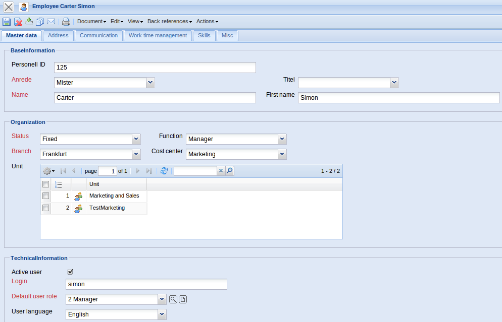 - Unit: The Units (organisation units, usually locations and/or departments)to which the employees belong to can be entered in this field. These units can be used as the basis for the local permission system (see administration guide).