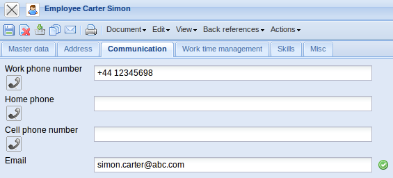 - Telephone, Private, Mobile und Email Address: These fields specifiy ways of communication with the employee via telephone (office, private and mobile/cell) and per email. Clicking the e-mail address opens the user's standard mail program with the stored email address. The e-mail address is also relevant for the time service function.