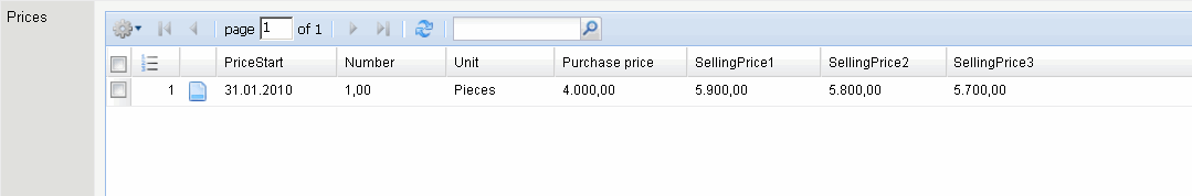 • Prices: Differing prices between purchase price and selling price can be entered here. These prices have validity as well as up to three price stages and are administered in Price.