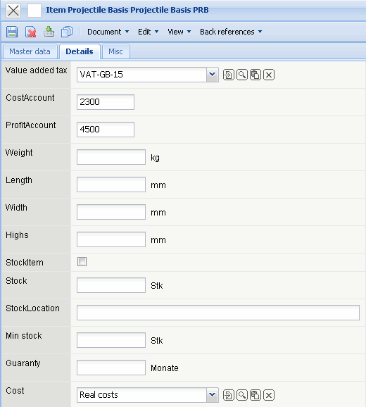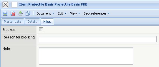 • Blocked, Reason: This box can be marked, if the item should no longer be used in the system. The reason for blocking can be entered in the next field.