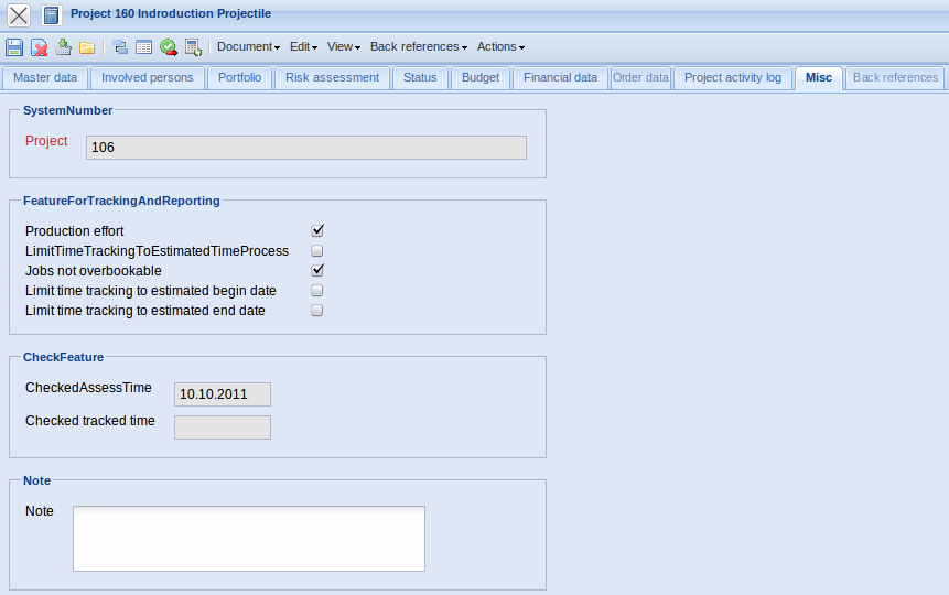 - Number: This alphanumerical field specifies the project distinctly in the system. The project number can be modified at anytime; but must be clear in the data pool. This number is usually preallocated with a number range and is inherited to all project-related elements (sub-projects, jobs, milestones, …).