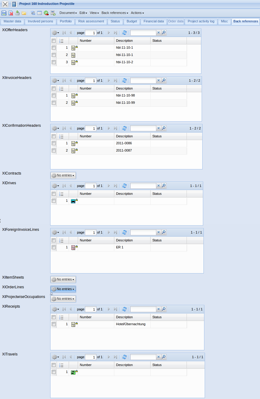 - Show invoice document: This action lists all transfered invoice documents for the defined project and the corresponding sub-project. Included are offers, external invoices (purchase/incoming invoices) and (outgoing) invoices.