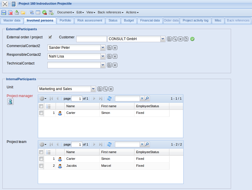All relevant information about the project and it's relationship to the master project (its hierarchical position in the project structure), the activity, customer, currency, project hourly rate, project leader, the necessary qualifications, assignment to the project team, cost unit and set-up data are defined in this form. Furthermore, the planned figures for beginning and end of the project, the project budget, the project costs and the project duration of the person responsible for the project are displayed here.