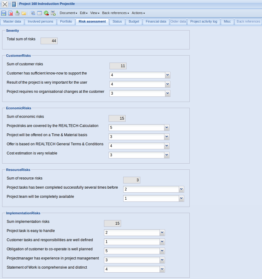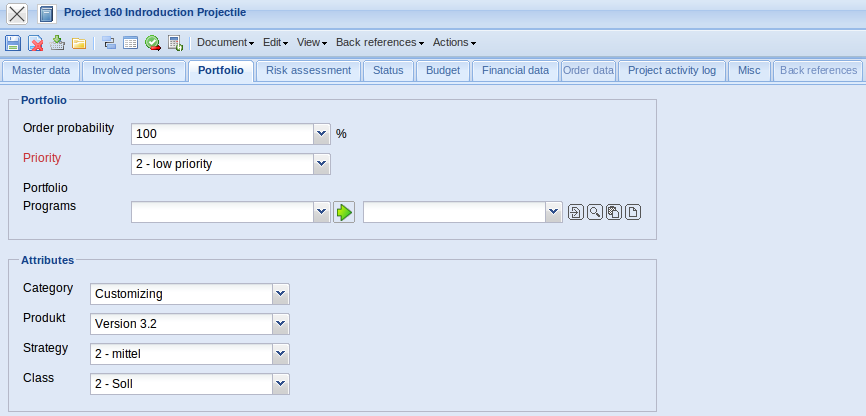 - Product, Strategy, Class, … : These fields classify, similar to the project types, the project and are selection criteria for the portfolio management and the project analyses.