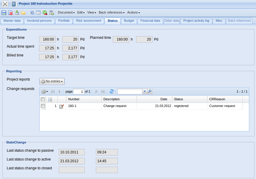 - Project-CRs: The entered change requests for the project are listed here. The changes are entered in the project modification form.