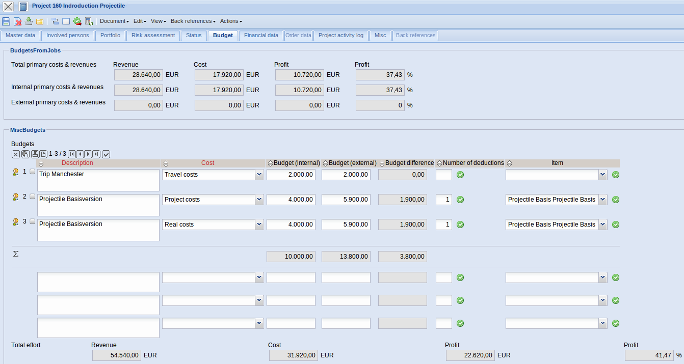 - Project (Primary Expenses + Secondary Expenses): These fields contain the probable internal project revenue, project costs and the profits (absolute and percental). These costs result from adding the primary expenses to the budgets (secondary expenses).