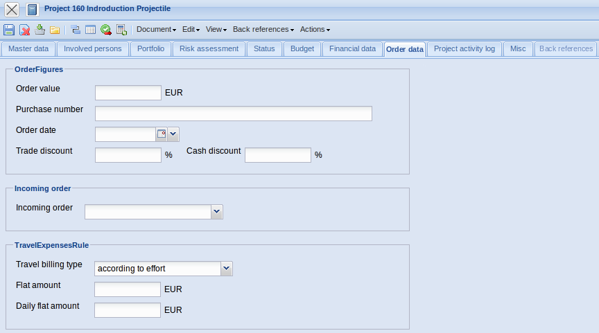 - Trade discount/Cash discount: A rebate for the project can be stored here. This rebate is preallocated for all invoices of the project.