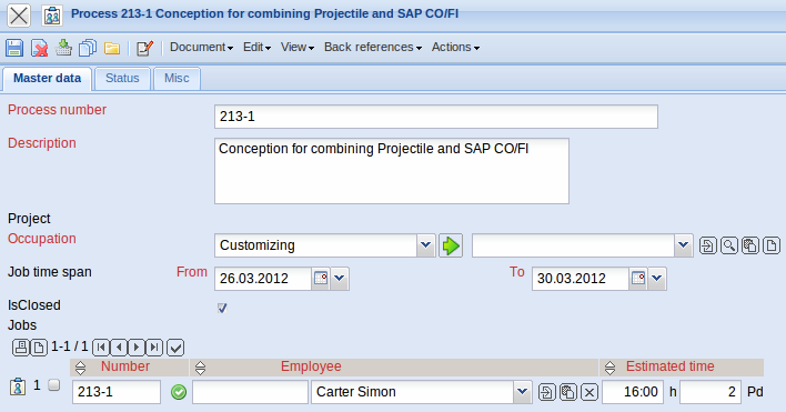 The Process form administer the tasks of the projects. In Projectile the processes are the summary of the the jobs. This form displays the occupations, the time span and the time/effort (planned, target, actual, rest, billable, billed).