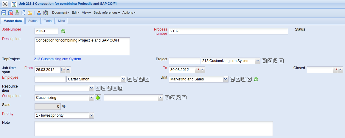 - Actual End: This field specifies the completion date of the job. The job must be closed from the user or project leader after the tasks have been completely worked through. A job must be either closed in the document itself or from the time tracking component.