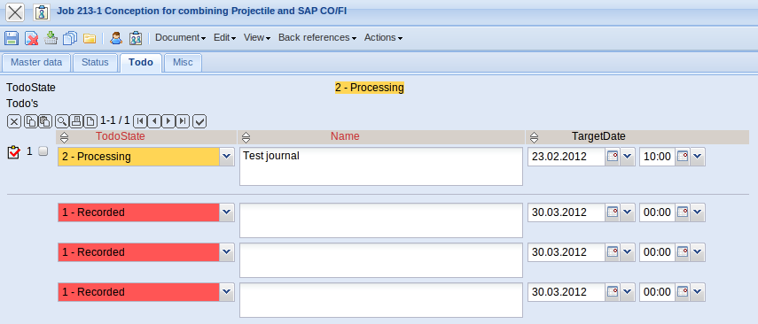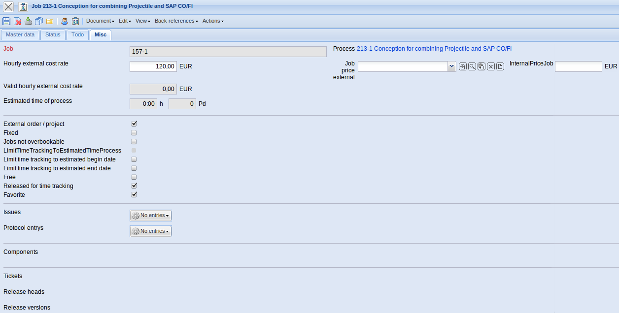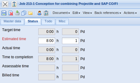 - Rest Time/Effort: This field displays the latest defined remaining time in hours from the tracking and recording component TimeTracker. The value from the jobs are transfered cumulatively into the projects.