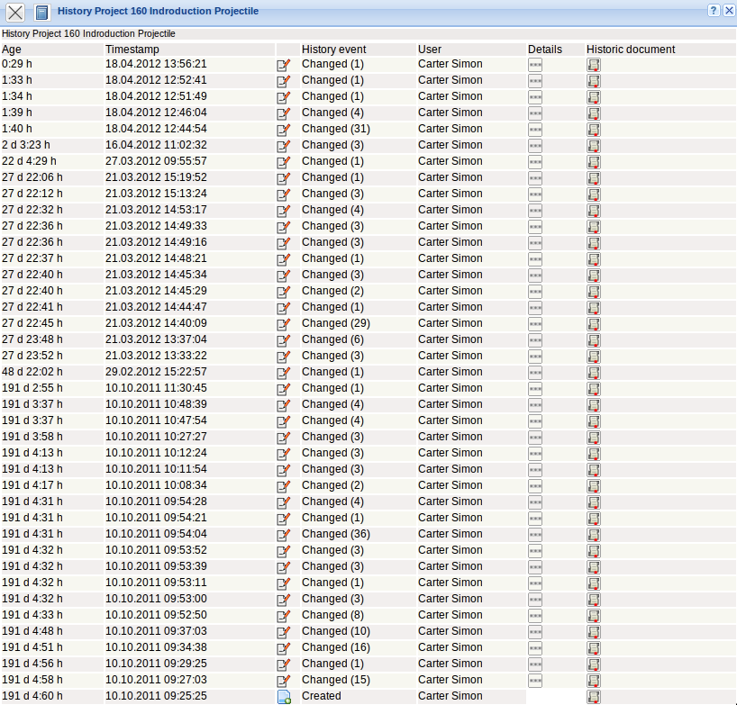 History protocols all modifications of a data record. Included is creating new data records, modifications on field level and deleting data records. The data from history is administered in the Projectile database and ends with the delete process, i.e. when a document is restored after being deleted through the trash/waste basket functionality, the original history of the document does nolonger exist.