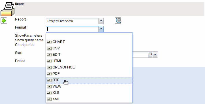 The format for the chart of the generated reports can be selected as CHART, CSV, EDIT (for editing master data), HTML, PDF, RTF (standard format for text processing), View (browser view), XML und XLS (MS EXCEL).