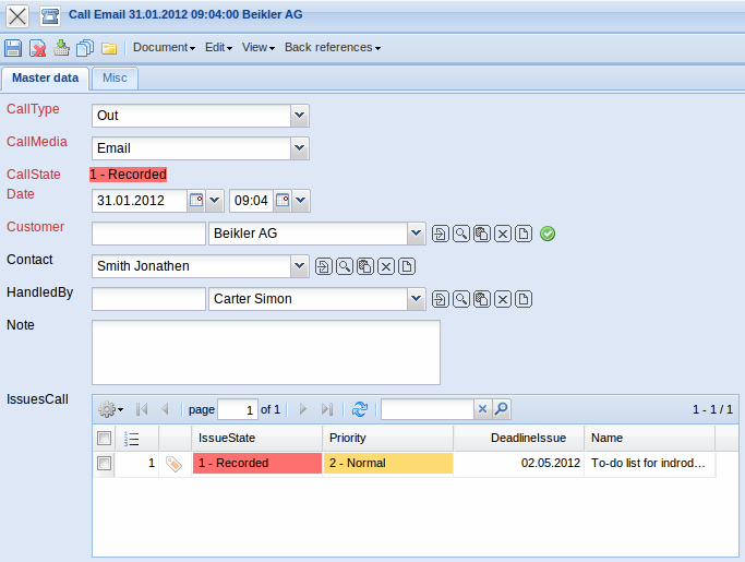 • Handled by: The employee responsible for the call is preset by the system here. The employee is administered in the employee menu.
