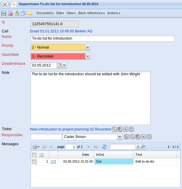 • Issues Call: Each call can consist of any amount of support cases. These support cases that correlate to the call are assigned with priority, issue state, issue deadline and responsibilies.