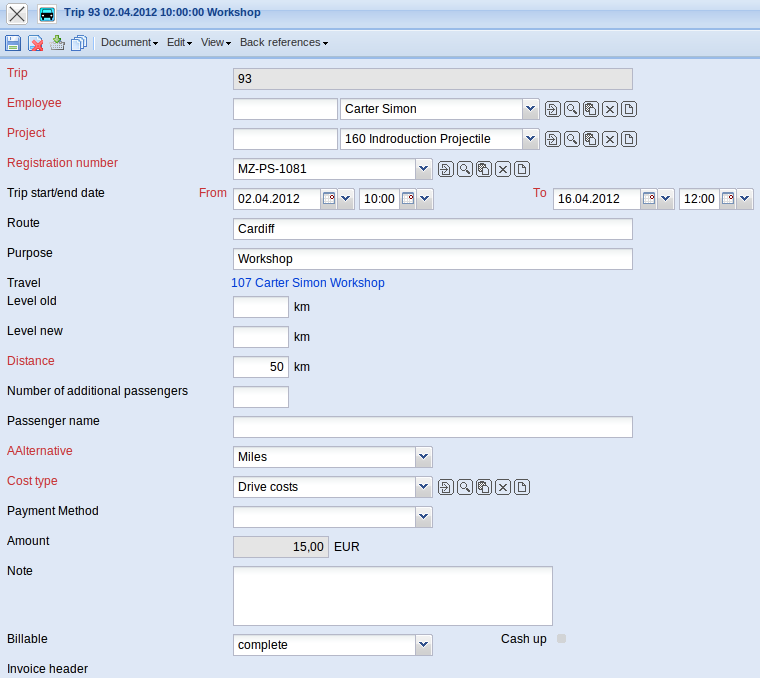 Using the Trip form, project-related trips and their costs, which the driver of an automobile in the scope of the project has caused, can be recorded. The trip costs can be assigned through selecting an already recorded trip through the identification of this trip and are also displayed with their corresponding cost type in the document type travel. Generally, it is possible to determine the trip costs through km-flat rates (distance from mileage in km-old and km-new), through the billing type hours (the difference from trip begin and trip end) or a combination of both. The appropriate rates are stored in the configuration form.
