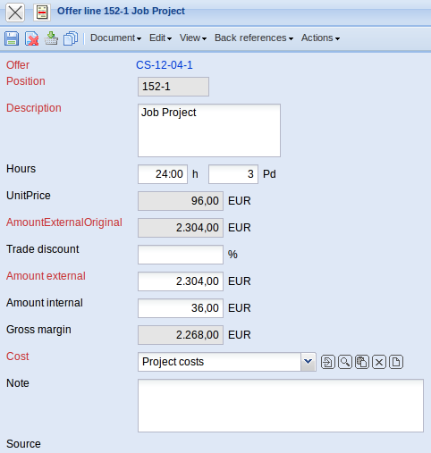 The Offer Position form consists of a link to the offer, as well as information about the position, description, amount of hours or units, the external and internal amounts of the offer position and the cost type. The offer value is determined from the amounts of the individual offer positions.