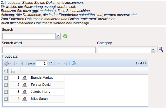 - Search machine: Search Word and Category: This element is used to filter the selected data from the categories. Only the document type job, employee, project, occupations and unit is available for selection. How to operate the search machine is described in chapter 3.2.2.3 and can be performed, if necessary, a multiple amount of times.