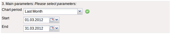 - Chart Period: This drop-down box refers to the chart's time span (elements start and end) and allows a parameterised definition of the time span for the time services. This selection (current week, current month, …, next week, last week, …) can be also used to simplify the manual definition of start and end.