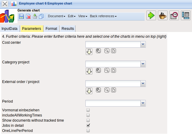 - Documents without Tracked Time: This option controls if the generated charts should list the rows without time/effort (check box marked) or be suppressed (check box unmarked).