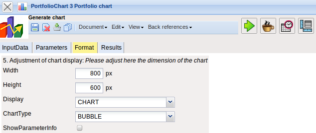 The Portfolio Chart displays combinations of projects (portfolio) through various axes. The basis for this chart is the combination of projects in the portfolio form. In this form, projects can be combined and the axes for the charts can be predefined.