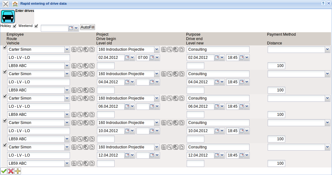 In addition to the detailed car travel expense entry, Projectile also offers rapid entry for car travel expenses. The kilometer flat rate is calculated from the amount of kilometers (distance). The appropriate rates are stored in the configuration form This function generates various trips, which data can then be added.