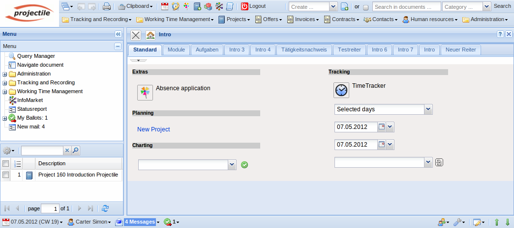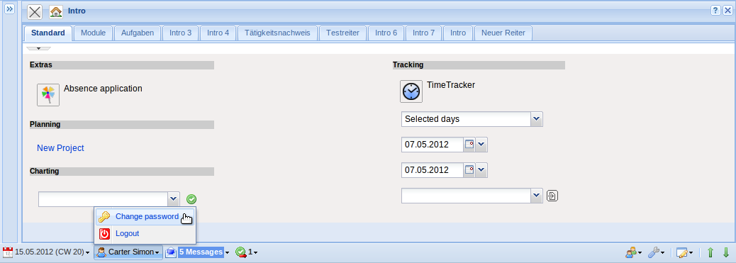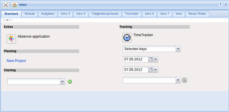 The intro is located in the central area and consists of user-definable entry screens. The example shows the standard screen with functionalities for creating new data, project planning, chart system and TimeTracker.