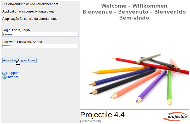 In order for the user to log on to the system, it is necessary for this user to be defined as an employee. After starting the application (either through a bookmark in the browser or entering a URL) the login screen appears. The start address generally has the following structure: http://projectile-server/projectile/start.