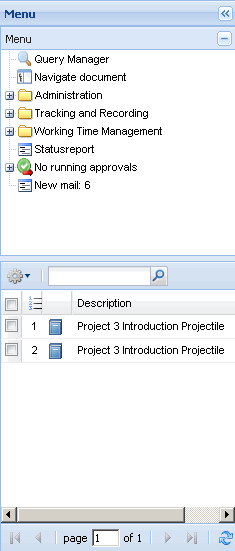 The left navigation menu consists of the functionalities mini-calendar, query manager, navigation and functions for the administration, using interfaces, tracking and recording components, various modules of the Enterprise version from Projectile and the menu items for approvals and internal messaging. Furthermore, the left navigation menu consists of the personal clipboard and the window manager.