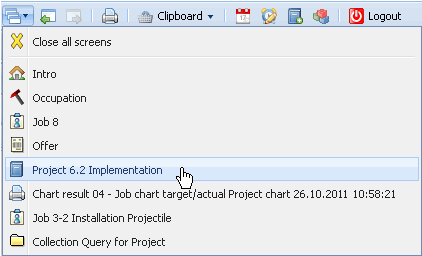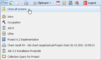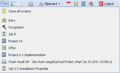 One item in the list consists of the close button for all opened screens and the items for opened screens with a link to the form. Changing to a form in the list, an item link is used …