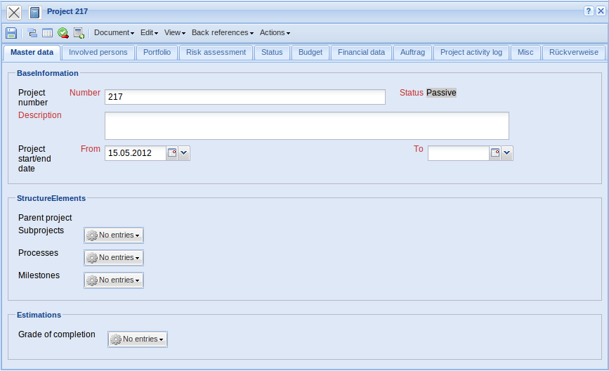 Using the functionality Planning, a project can be defined or planned either manually or using a template. Furthermore, the MS-Project interface is optionally available.