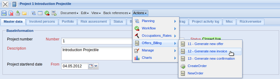 Beneath the form bar is the menu bar for administering the data in the form (data record). Not all functionalities are always visible. Some of the functionalities are also stored in the menu bar of the form: