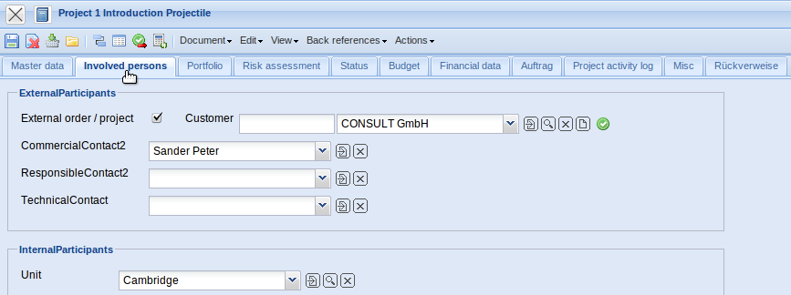 Several forms have tabs. The tabs structure the forms better and provide a better overview, especially for forms with many elements. The tabs can be configured in the xml templates by the administrator (see Administration Guide).