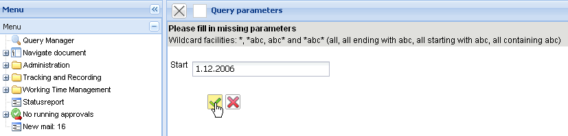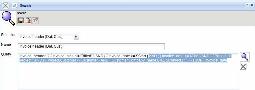 The queries of the advanced search can also be more complex. The following example finds all the billed invoices during the period of start (>= $Start) to end (< = $End):