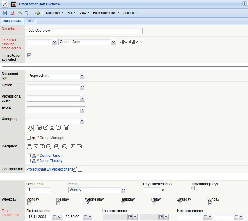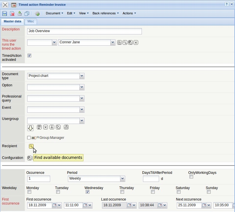 Then the description field is filled out and a document type is selected (here project chart). Then the recipient of the timed action is determined. Individual employees and groups (here all users of the group “manager”) are defined as recipients of the timed action.