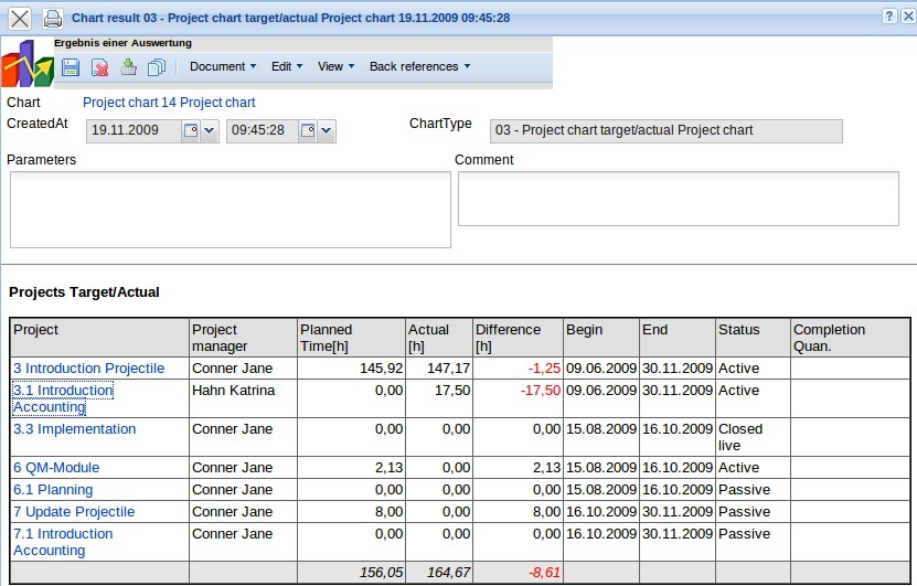 The timed action generates (as long as it is active) periodical target/actual comparisons on the job level for all selected projects relating to the current quarter and then sends an e-mail to the recipient.