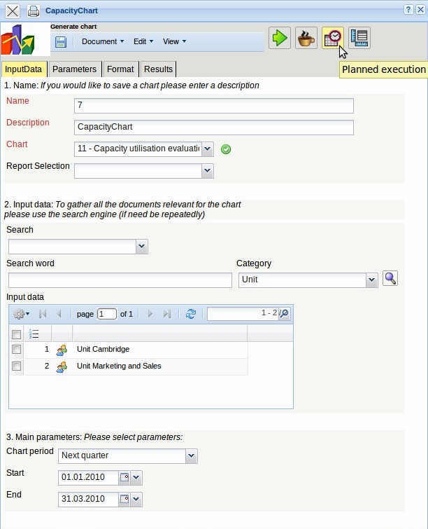In the following example, a capacity chart is automated. First, a chart is opened and the selection criteria is filled out. In the example, all employees of the units Cambridge and Marketing and Sales and applications for a capacity chart should be generated for the next quarter. Using the function “timed action” …