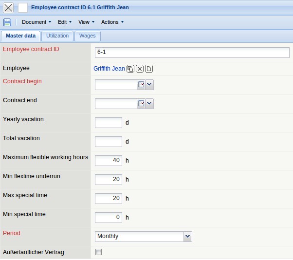 In the contract, various fields are pre-populated by the system (maximum flexible-hours and special hours buffer, target time Monday to Sunday, periods from the calendar of the assigned employee and the values maximum working time and capacity from the employee document). Each contract has a contract period. The contract begin is a required field and the contract end may (with open-end contracts) remain empty. Projectile checks the contract period when modifying contracts and will not allow contracts to overlap.