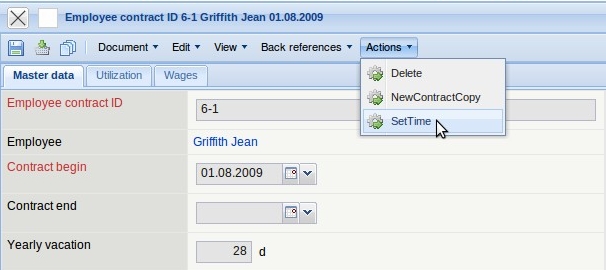 Per employee, any number of contracts can be defined. The contract dates may however not overlap. In the following example, the first contract of the employee, will expire on 30.11.2009. After clicking the action “set time” …