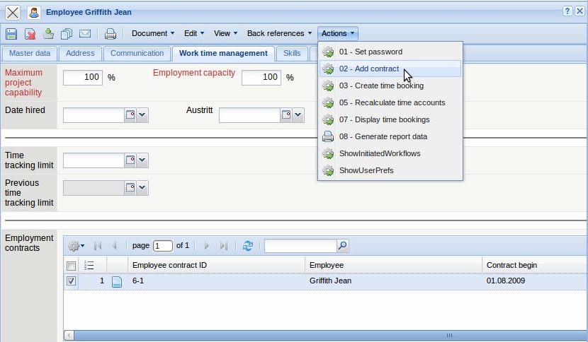 In the following example, a contract is created for the employee Jean Griffith. Using the action “Add contract”, a new document of the type employment contract is opened.
